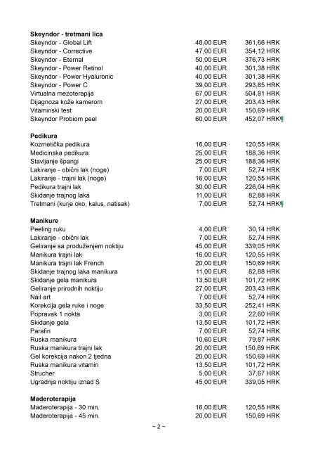 Na raspolaganju imaju usluge njege lice i tijela, mezoterapiju, manikuru i pedikuru, ugradnju trepavica te mnoge druge.