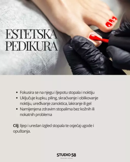 Naši tretmani pedikure prilagođeni su individualnim potrebama, uz korištenje profesionalnih alata i higijenski sigurnih metoda. Cilj je dugoročno poboljšanje stanja stopala, a ne samo kratkotrajni estetski učinak.