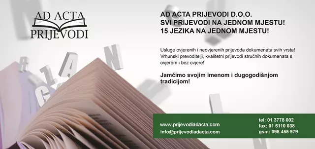 AD ACTA PRIJEVODI D.O.O. sudski tumači i prevoditelji tvrtka je koja se bavi prijevodima i prevođenjem: diploma i svjedodžbi, osobnih isprava, pravnih akata, ugovora, medicinske dokumentacije, potvrda, certifikata, dokumenata za rad u inozemstvu.