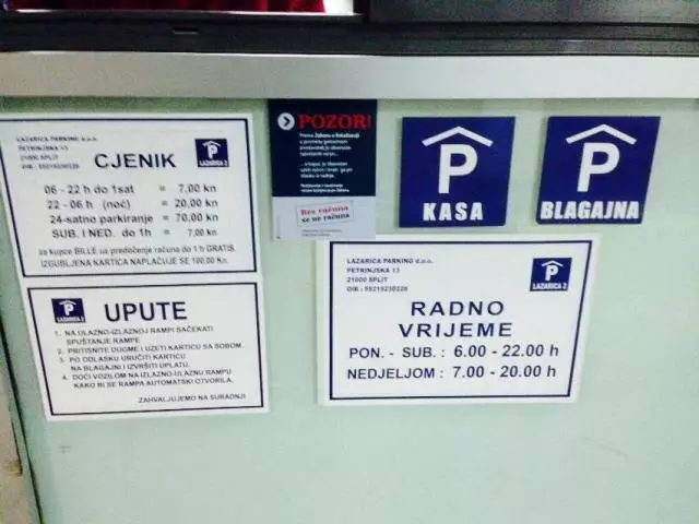 Garaža ima 74 parkirna mjesta,a usluge parkiranja su 1 sat gratis, za posjetitelje trgovine Billa. Za pretplatnike parkiralište je otvoreno od 0-24 h.