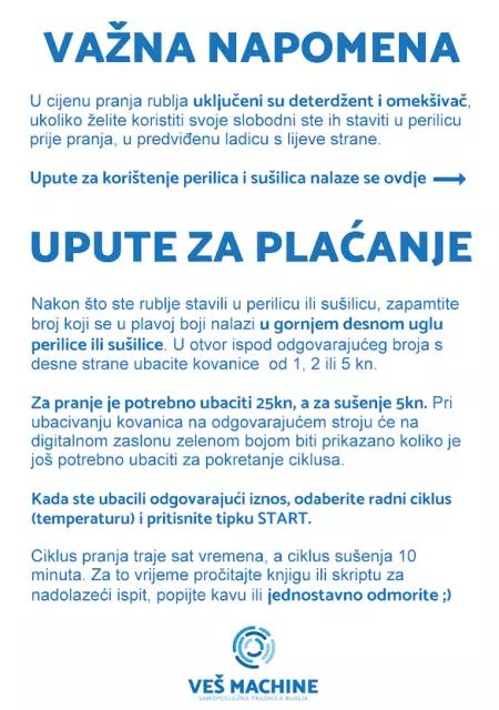 U samoj praonici rublja na raspolaganju su 4 perilice i 4 sušilice sa uputama za upotrebu. Ukoliko negdje zapne, stojimo na raspolaganju te smo dostupni na svim raspoloživim sredstvima komuniciranja - telefon, e-poštu, Facebook ili Instagram.