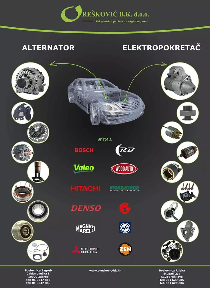Prodaja autodijelova te alternatori i anlaseri dio su djelatnosti koju obavlja tvrtka OREŠKOVIĆ B.K. d.o.o. iz Zagreba.