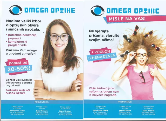 OMEGA OPTIKE d.o.o. je tvrtka koja sjedište ima na području grada Zagreba. Kod velikog broja zadovoljnih kupaca prepoznata je po profesionalnom pristupu radu. Optika se također nalazi i u Varaždinu i Puli.