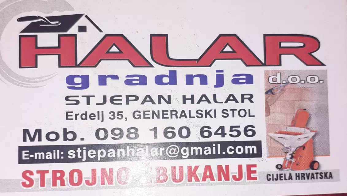 HALAR GRADNJA d.o.o. nudi usluge strojnog žbukanja. Nalazi se u Generalskom stolu, na adresi Erdelj 35.
