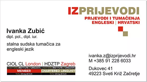 Vlasnica obrta, Ivanka Zubić, iskusna je prevoditeljica i punopravna članica Londonskog Instituta Lingvista (CIOL) koji ju je ovlastio za prevođenje i tumačenje u englesko-hrvatskoj jezičnoj kombinaciji. Također je članica Hrvatskog društva znanstvenih i tehničkih prevoditelja, kao i kvalificirana engleska pravnica. Zahvaljujući tom iskustvu, izvrsno poznaje pravnu i poslovnu terminologiju engleskog i hrvatskog jezika.