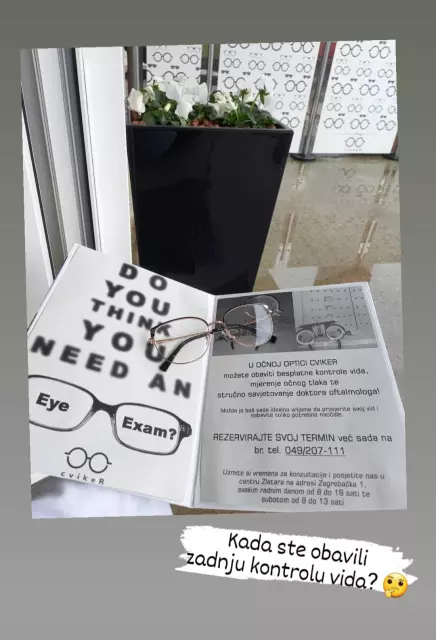 OČNA OPTIKA CVIKER d.o.o. za vas vrši servis naočala, besplatne kontrole vida, stručno savjetovanje te širok asortiman dioptrijskih okvira i sunčanih naočala. Nalazi se u Zlataru, na adresi Zagrebačka ulica 1.