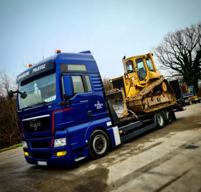 Za transport građevinskih, industrijskih ili poljoprivrednih strojeva, koristimo specijalizirane niskopodne prikolice – labudice, koje omogućuju stabilan i precizan prijevoz teških i glomaznih tereta.