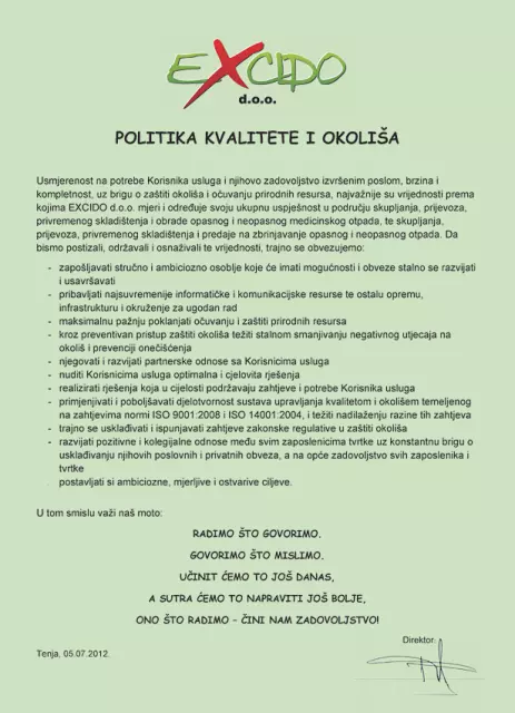 Tvrtka EXCIDO D.O.O. posluje od 2005. godine te obavlja zbrinjavanje otpada i sekundarnih sirovina. Tvrtka trenutno zapošljava dvanaest djelatnika.